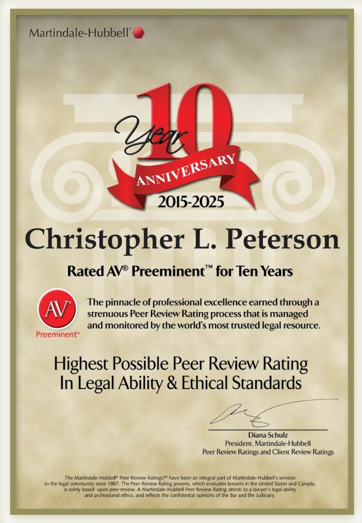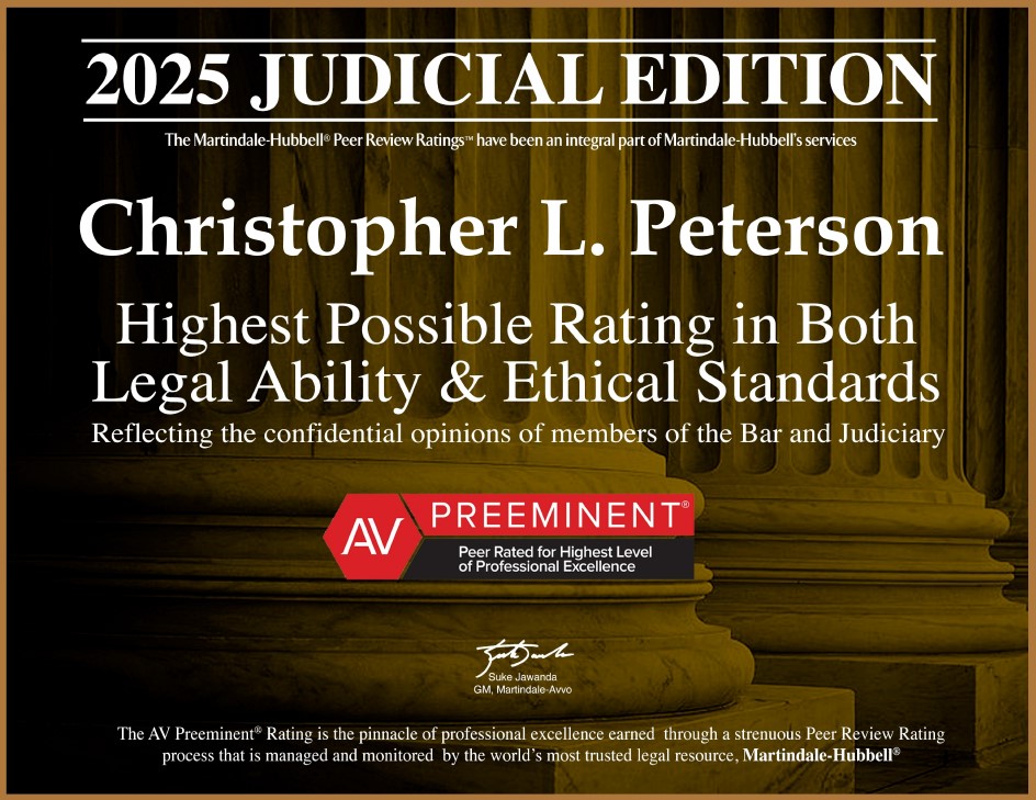 Christopher L. Peterson is the managing litigation partner at Peterson Law, LLP, founding the firm in 2017. Mr. Peterson has practiced law since 2001, developing extensive experience in his primary focuses of business, real estate, and tort litigation.